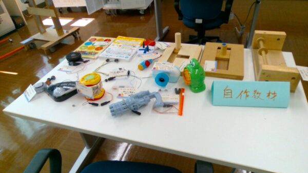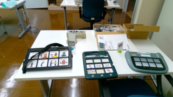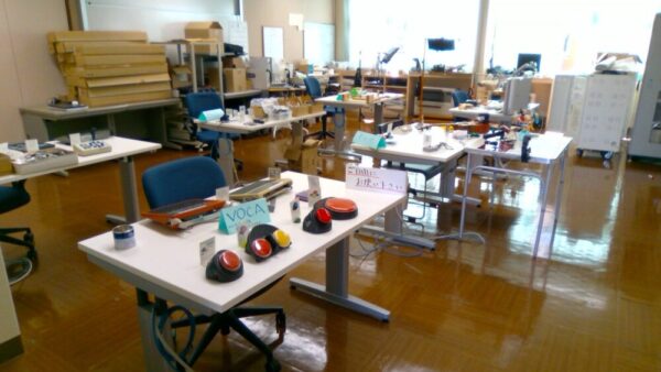 夏休み期間中、本校にある各種スイッチやVOCAなどのコミュニケーション機器、自作教材の展示をしています。夏休み明けの授業づくりに向けて、教職員もブラッシュアップしていきたいですね。