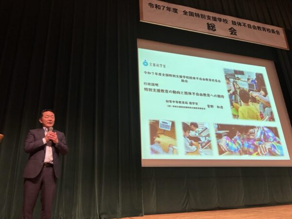 全国特別支援学校肢体不自由教育校長会では、文科省担当者からの肢体不自由教育に関する行政説明のほか、「肢体不自由特別支援学校の課題と経営」と題した講演がありました。