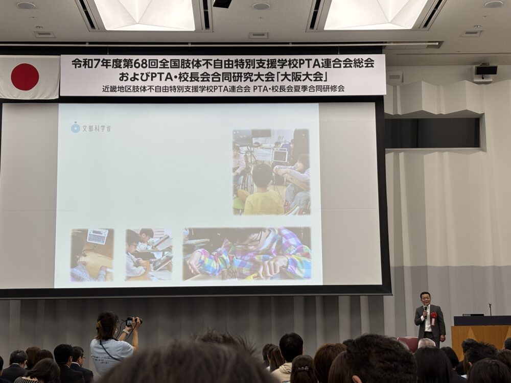 山梨県立甲府支援学校 > 甲養ブログ > 【校長室通信103】全国肢体不自由特別支援学校PTA連合会総会 PTA・校長会合同研究大会「大阪大会」① 2025年10月1日カテゴリー: 甲養ブログ 校長室通信 【校長室通信103】全国肢体不自由特別支援学校PTA連合会総会 PTA・校長会合同研究大会「大阪大会」① 夏季休業中の8月20日(水)・21日(木)に大阪府大阪市北区にあるグランキューブ大阪(大阪府立国際会議場)において、全国肢体不自由特別支援学校PTA連合会総会 PTA・校長合同研究会「大阪大会」が開催され、校長が参加しました。 この大会は、特別支援教育の諸課題等の解決に向け実践研究を進めると共に、誰もが自分らしく生きる社会づくりに向けたPTA活動を推進するため、全国特別支援学校肢体不自由教育校長会と合同で開催する研究会で、年1回開催されています。 開会式の後、基調講演として文部科学省初等中等教育局視学官・特別支援教育課特別支援教育調査官の菅野氏から「肢体不自由のある子供たちの学びの充実」をテーマに講演をいただきました。