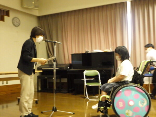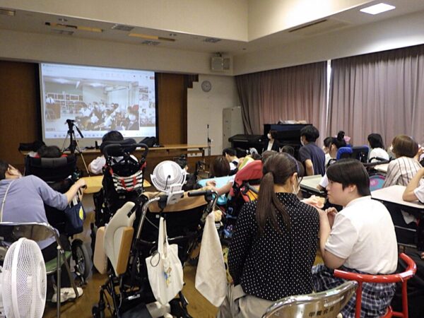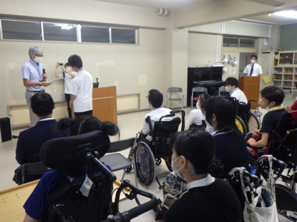 小学部、中学部、高等部、訪問学級の各代表者に校長や教頭から通信表を手渡しました。通信表の授与とあわせて、前期のがんばりや成果が伝えられると、各会場から大きな拍手が上がりました。
