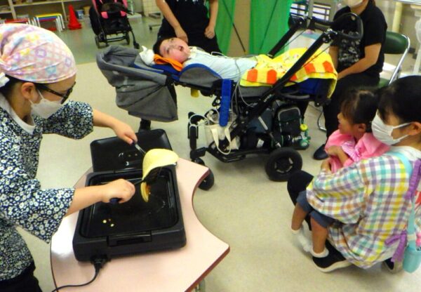 山梨県立甲府支援学校 > 甲養ブログ > 訪問学級 在宅のつどい 2025年10月17日カテゴリー: 甲養ブログ 訪問教育 訪問学級 在宅のつどい 10月8日(水)に、訪問学級の在宅児童を対象に『訪問学級 在宅のつどい』を学校の上下肢訓練室で行いました。2名の児童が登校して、甲養祭のビデオ発表に向けて学習した『ぐりとぐら』のカステラ作りを友達と一緒に楽しみました。