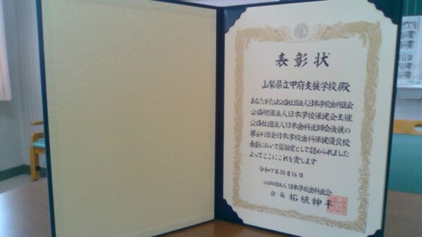 令和7年10月16日、本校の歯科医摂食指導・口腔ケア・日頃の摂食指導が評価され、「第64回全日本学校歯科保健優良校表彰」にて「奨励賞」をいただくことができました。昨年度の「山梨県口腔衛生推進優良学校」に続き、今度は全国規模での受賞となりました。保護者の皆様をはじめ、山梨口腔保健センター、学校歯科医の秋山先生など、多くの方々と連携し、共に取り組んでいる本校の摂食指導が評価されたこと、大変うれしく思います。