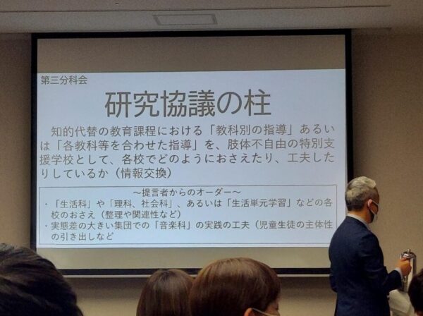 2日目の11月20日(木)は、提案発表やグループ協議が、10の分科会 に分かれて行われました。「授業改善」「学習指導(教育課程ごと3グループ)」「自立活動」「健康教育」「生活指導・寄宿舎教育」「情報教育・支援機器の活用」「キャリア教育・進路指導」そして「地域との連携」と、幅広いテーマについて具体的な事例や課題が共有されました。各分科会では、教育現場における実践的な工夫など活発な意見交換が行われました。