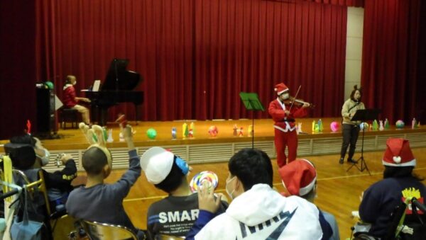 中学部の先生たちがピアノ、ヴァイオリン、クラリネットでクリスマスキャロルを演奏して、子どもたちと楽しみました。