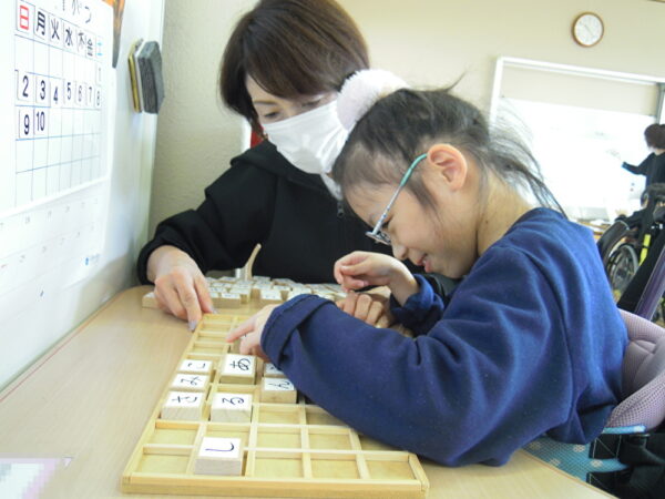 11月中旬、小学部の国語の授業では、文字板を使って言葉づくりの学習をしていました。