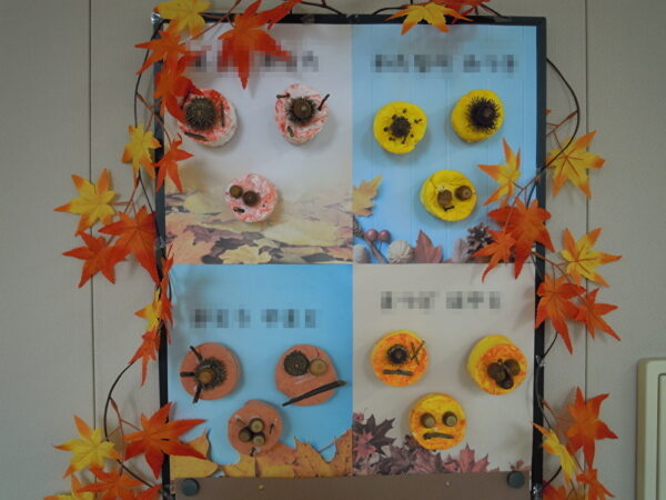 季節をさかのぼり、昨年11月下旬の晩秋のころ、小学部の廊下に「木の実のケーキ」の図工の作品が飾られていました。