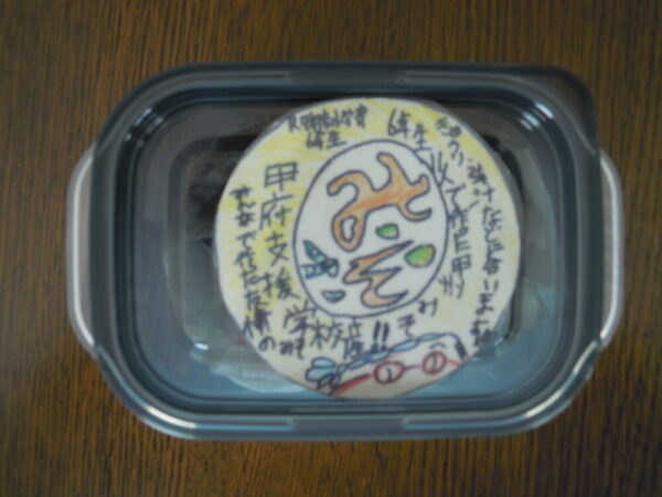 山梨県立甲府支援学校 > 甲養ブログ > 【校長室通信164】味噌づくり 2026年2月4日カテゴリー: 甲養ブログ 校長室通信 【校長室通信164】味噌づくり 12月下旬、小学部6年生の児童から手作り味噌をいただきました。 この味噌は、昨年度5年生の時から学年で取り組んできた学習ということで、みんなで味噌の製造会社に見学に行って味噌づくりを体験し、それを1年間熟成させてようやく完成したとのことです。 味噌づくりの前後には、理科の学習で大豆づくり(収穫はほとんどできなかったとのことですが・・・)をしたり、図工でパッケージのデザインを考えて制作したり、出来上がった味噌を使って家庭科で味噌汁をつくったりもしたとのことです。 とても貴重な味噌をおすそ分けしてもらいました。ありがとうございました。