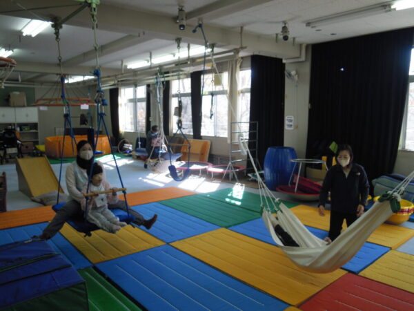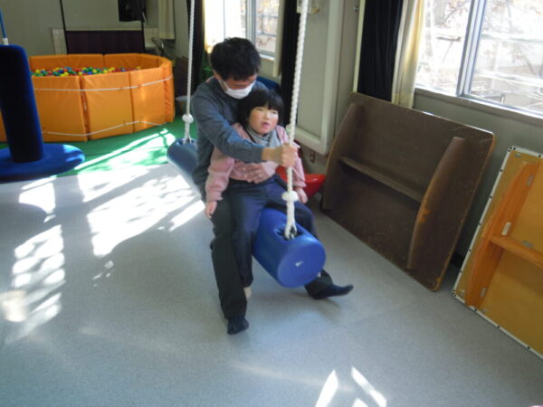 2月上旬のこの日は、小学部のグループが自立活動の授業でブランコやハンモックで揺れとそれに合わせた自分の体幹の動きを楽しみながら感じ取っていました。