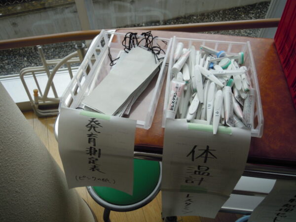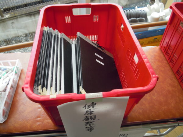 体温計、健康観察簿、緊急時対応マニュアル、保健要覧、嘔吐物処理セットなど、どれも大切な物品です。
