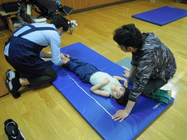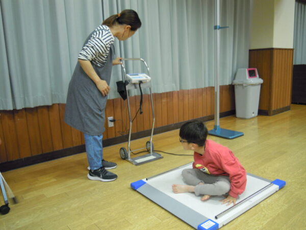 体重は、広めの台座の上に一人で乗ったり、先生に抱えられた後先生分の体重を差し引いたり、車椅子ごと乗って測ることもあります。